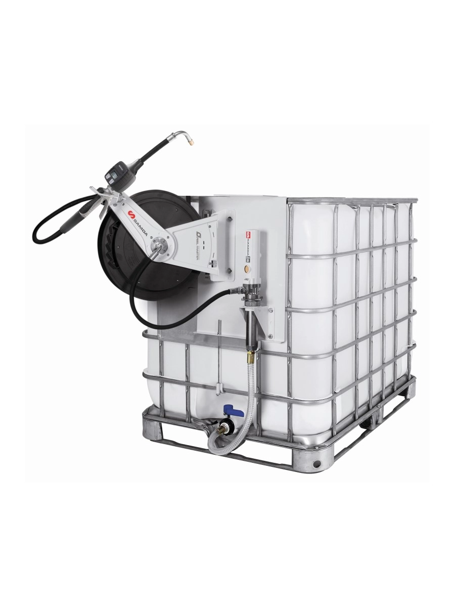 Насос для масла 3:1 с катушкой со шлангом для масла 10 м и электронным счетчиком на кронштейне сбоку контейнера. В комплект входит всасывающий шланг для нижнего выходного отверстия контейнера.