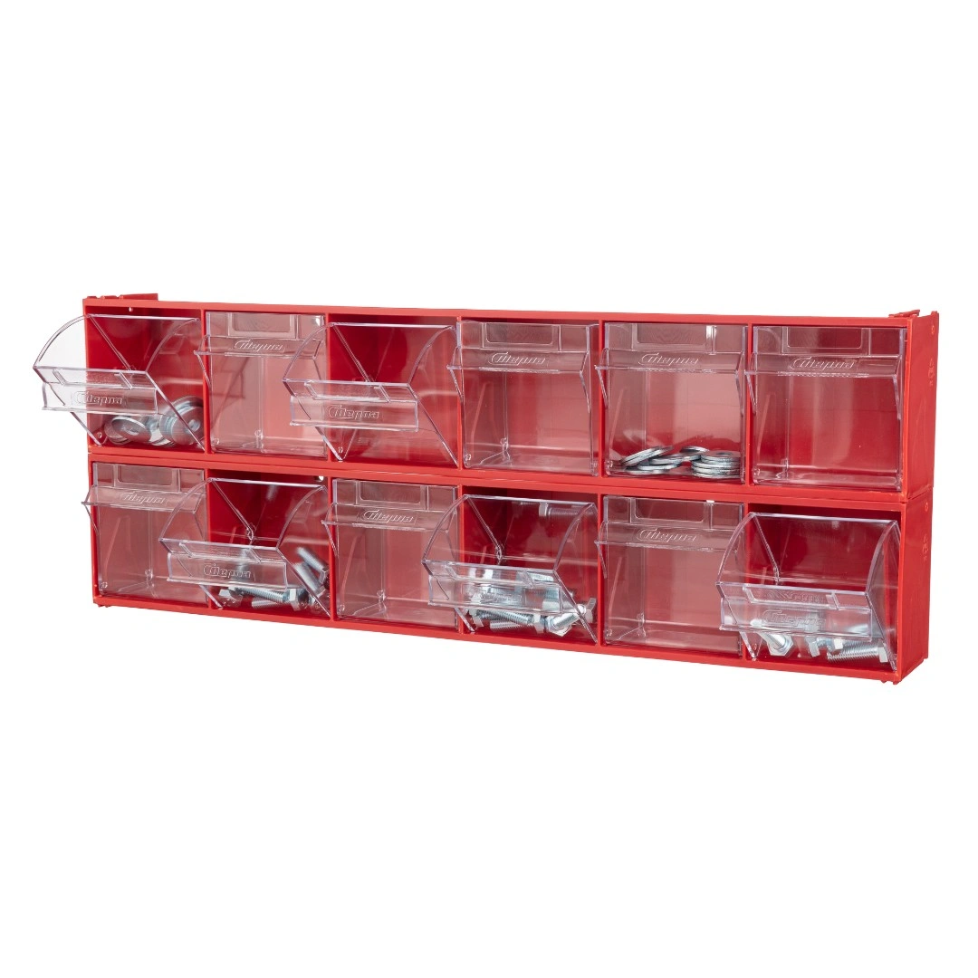 Короб откидной Стелла-техник F-600-6 (600х96х112мм.) 6 ячеек, красный, прозрачный служит для хранения мелкоштучных предметов. Данная система хранения не подвержена случайному опрокидыванию. Откидные стандартные ячейки обеспечивают быстрый доступ к необходимым предметам. В случае необходимости полного высыпания или наполнения внутренние ячейки легко извлекаются. Полезный внутренний размер каждой ячейки 88х65х70мм. Специальный пластик, из которого выполнен короб, выдерживает значительные нагрузки и обладает оптимальной эластичностью. На основе данных коробов можно сформировать многоярусную систему хранения вертикально, в том числе и с коробами других размеров, таких как F-600-9, F-600-5 и F-600-4 по принципу пирамиды. Использование в качестве дополнительного элемента специальных металлических рам, позволяет комплекту коробов нести большие нагрузки в напольном, настольном и настенном варианте. Короб данной модели легко можно прикрепить к стене или установить на специальные кронштейны (Артикул: Кронштейны-FOX-750). Обзорность содержимого сквозь прозрачные внутренние ячейки, наличие отсека для информационных бирок, легкое извлечение внутреннего короба для опустошения и наполнения, все это является неоспоримым преимуществом откидных коробов серии F. Температура эксплуатации от -10 до +70С.