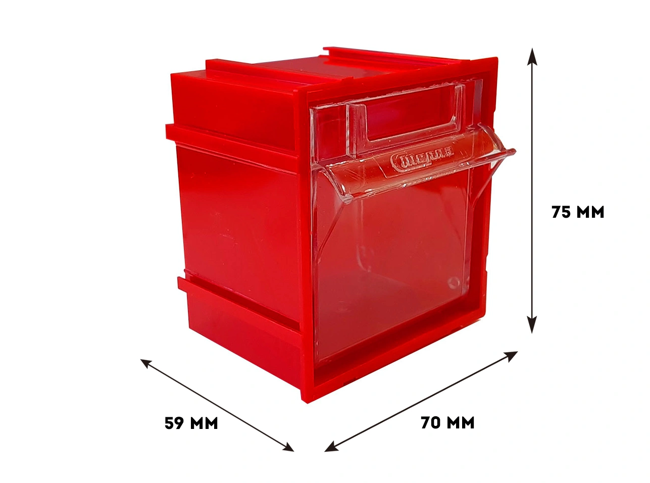 Короб откидной Стелла-техник Single-101 красный, прозрачный предназначен для хранения мелкоштучных изделий. Данная система хранения не подвержена случайному опрокидыванию. Полезный внутренний размер ячейки 50х43х47мм. Пластиковый короб имеет специальные пазы, благодаря которым можно соединять между собой несколько коробов, наращивать в ширину и высоту до нужных размеров, образуя модульную систему. На задней стенке присутствуют отверстия, что позволяют навешивать их на стену. Преимущества: Обзорность содержимого сквозь прозрачные внутренние ячейки. Стандартный цвет наружной кассеты откидного короба-красный, внутренней – прозрачный. На внутреннем коробе есть специальный отсек для информационных съемных бирок. Легкое и быстрое извлечение внутреннего короба для опустошения или наполнения. Температура эксплуатации от -10 до +70С.