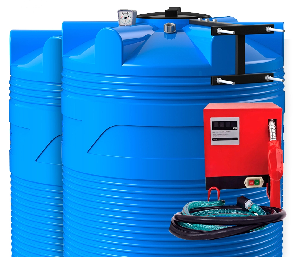 Бак выполнен из прочного полиэтилена и усилен продольными рёбрами жёсткости, что делает его устойчивым к внешним нагрузкам и деформациям при эксплуатации. Заправочный модуль подключается к электросети и обеспечивает стабильную подачу топлива с учётом расхода.