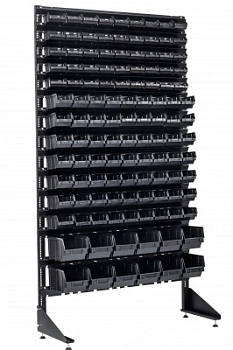 Универсальный складской стеллаж с пластиковыми контейнерами под хранение крепежа и метизных изделий. Чаще всего стеллаж применяется на складах или магазинах в качестве витрин торговых. А так же на всех производственных предприятиях. В гараже, на станции техобслуживания, ремонтных и швейных мастерских.