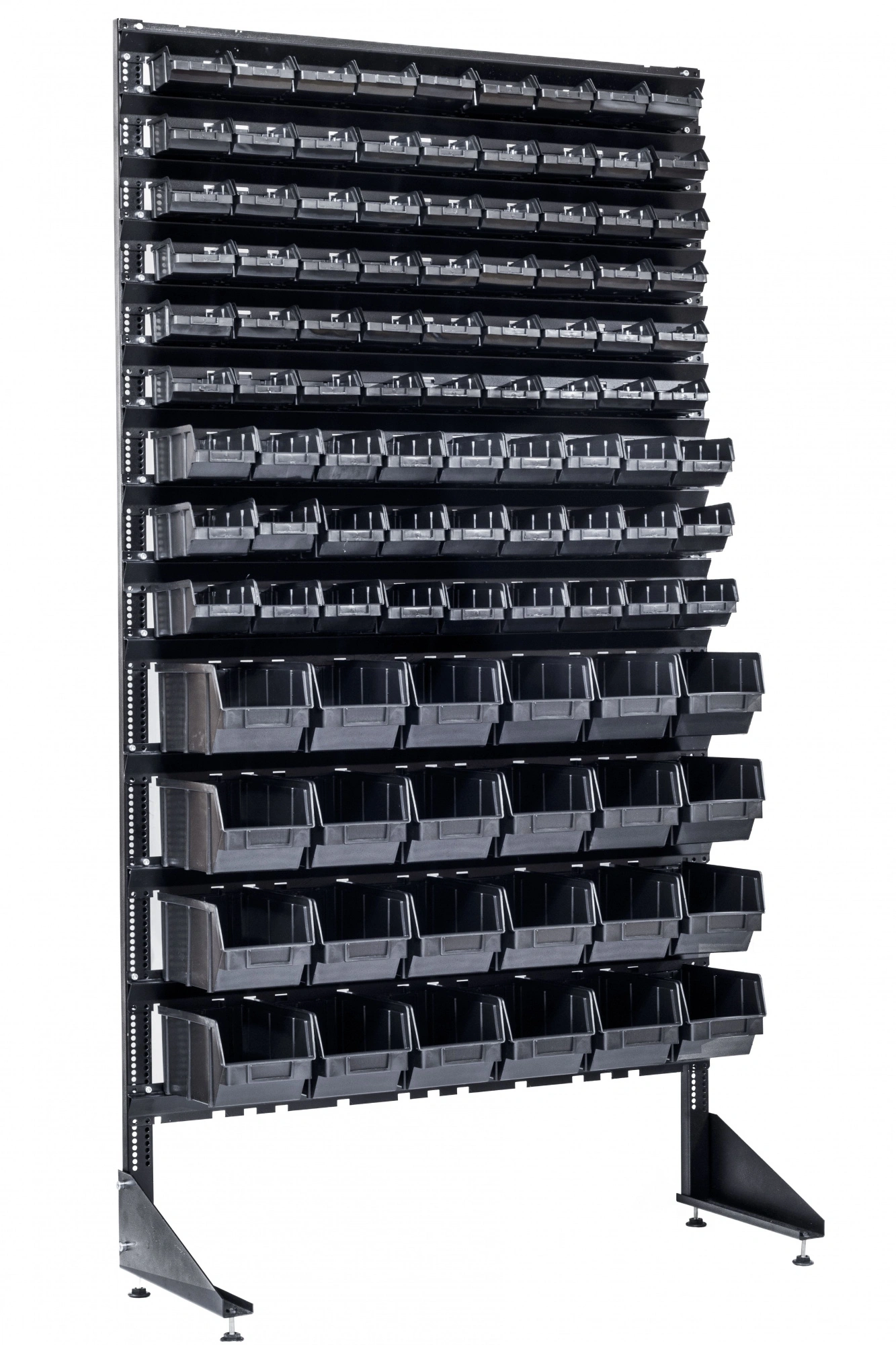 Конструкция данного оборудования, позволяет комбинировать ящиками разных размеров. Перфорация на стойке, позволяет менять шаг в зависимости от размера лотка. Траверсы крепятся на стойку болтами М6, (болты в комплекте).
