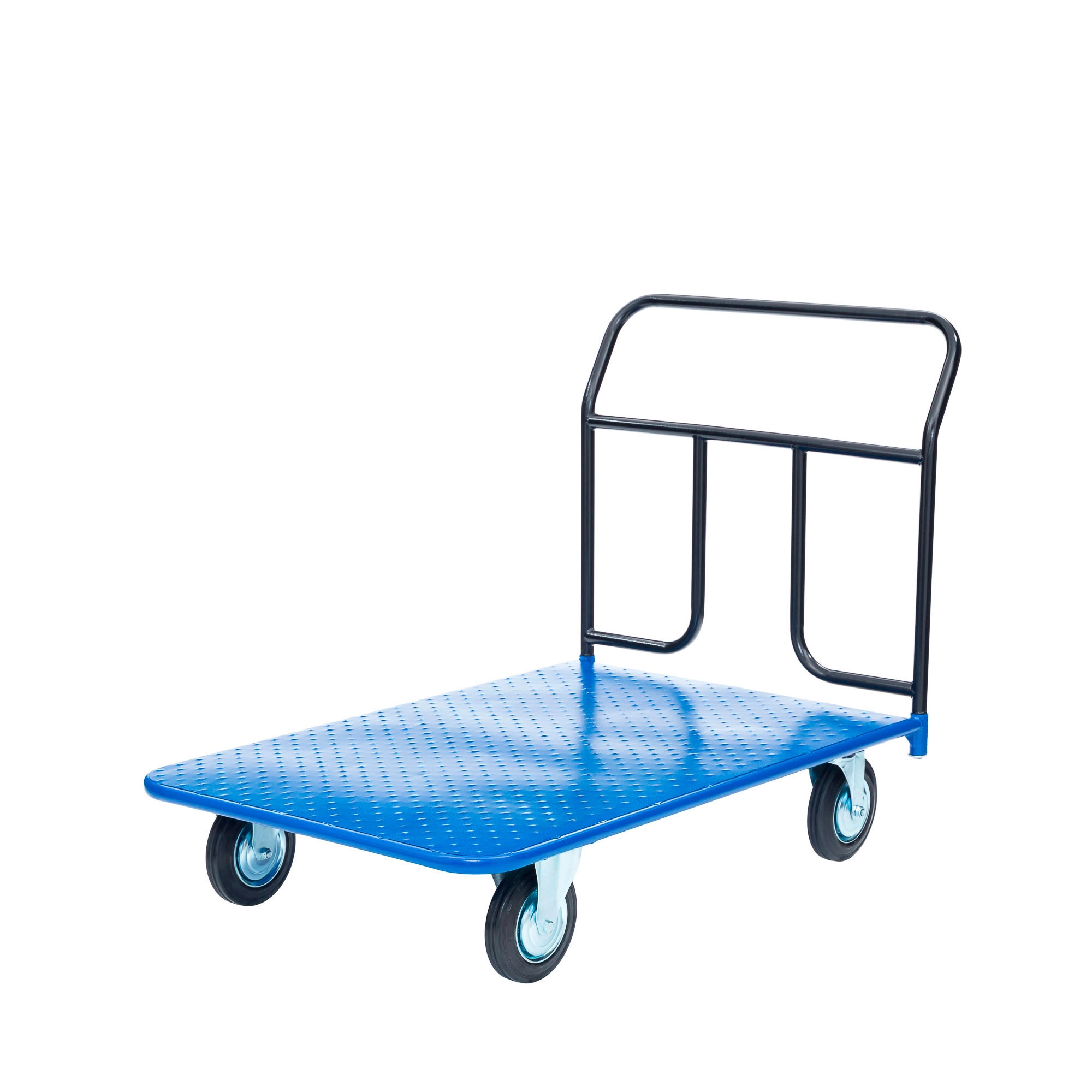 Платформенная 4-х колесная тележка КП-450-200-И используется для перемещения различных грузов в складских помещениях. Ручка крепится к платформе болтами, для компактного хранения можно снять, высота ручки 750мм. Платформа имеет уникальную рельефную, полимерную, противоскользящую поверхность, размером 700х1250мм. Цвет - синий, шагрень. Тележка комплектуется: метизами для крепления, двумя поворотными и двумя неповоротными промышленными колесами, диаметром 200мм., из черной стандартной резины, от всемирно известного, ведущего итальянского производителя Tellure Rota. Грузоподъемность до 690кг.